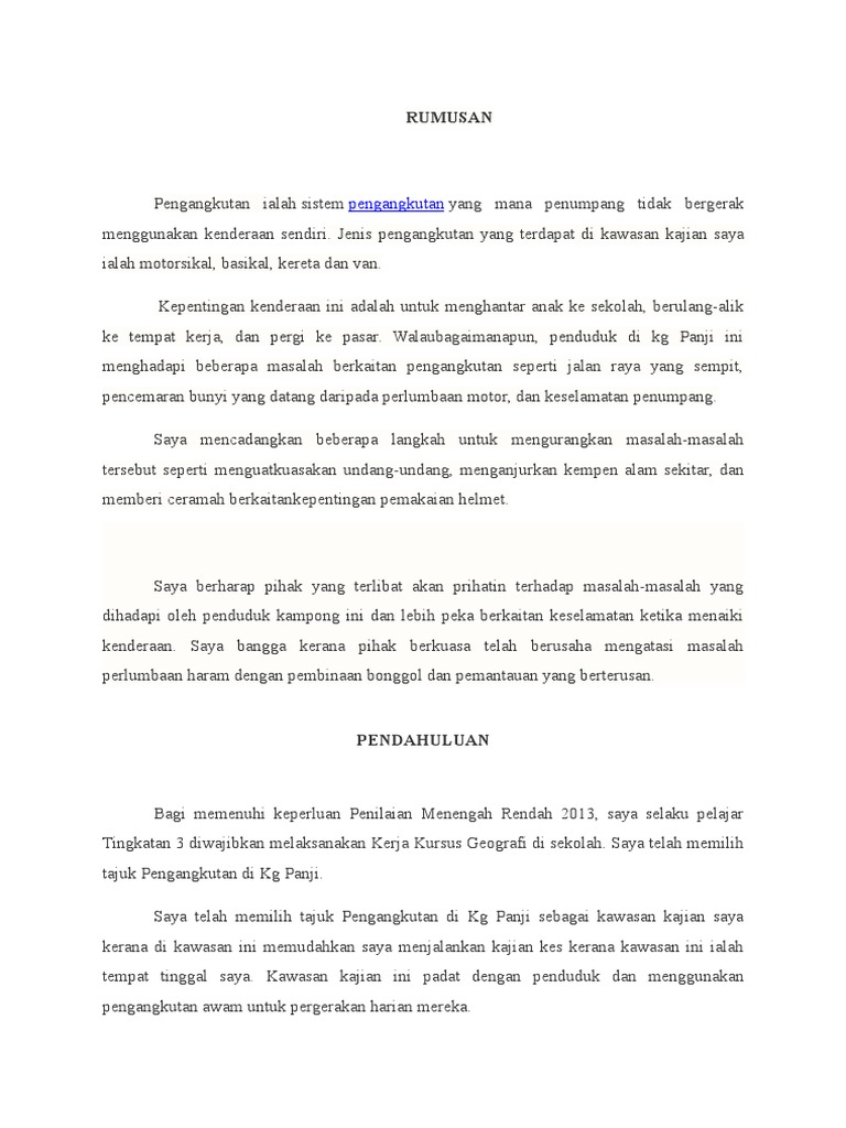 Kerja kursus geografi pmr 2013 docx kerja kursus geografi pmr 2013 pengangkutan awam nama tingkatan sekolah nama guru tarikh hantar tajuk kajian course hero. (7) cadangan penambahbaikan terhadap pengangkutan. Pengangkutan awam di taman tun syed nasir saya telah menjalankan kajian tentang pengangkutan awam di taman tun syed nasir, tanjung agas, tangkak, johor. Bagi memenuhi keperluan ini saya dengan penuh yakin memilih kawasan kediaman saya iaitu kampung sentol patah. Posted by kings at 6:12 pm.