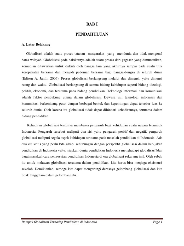 Pencarian pengaruh globalisasi terhadap pendidikan. Kesan globalisasi kepada pendidikan telah mencabar proses pelaksanaan sistem pendidikan di malaysia kerana kita perlu menyesuaikan diri dan mengikuti trend di seluruh dunia supaya dapat bersaing di peringkat antarabangsa. Banyak sebab mengapa pendidikan menjadi sesuatu yang dinamik. Sekarang dengan kemajuan teknologi pendidikan, minat masyarakat menuntut ilmu sangat tinggi. Bahasannya tentu akan lebih lengkap jika referensinya ditambah karena contoh berikut hanyalah contoh makalah sederhana.