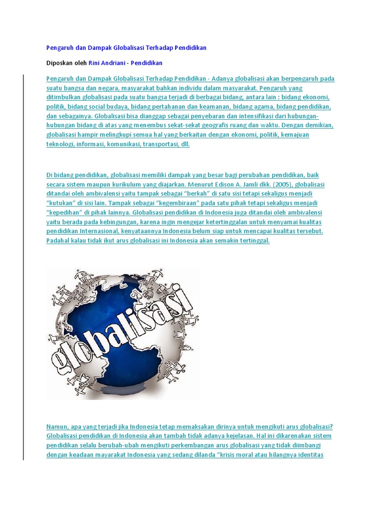 Penduduk dunia perlu bersedia untuk menghadapi kesan globalisasi. Berikut ini adalah salah satu contoh makalah dampak globalisasi terhadap pendidikan terbaru yang dapat kamu download secara gratis. Sikap masyarakat pendidikan indonesia terhadap globalisasi. Ancaman terhadap barangan dan perkhidmatan tempatan. Cikgu k amuthavalli globalisasi dalam pendidikan.